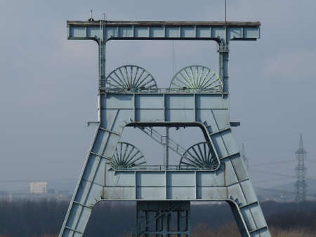 Old, used mine shaft headgear with pulley wheel coal mine EWALD in germany