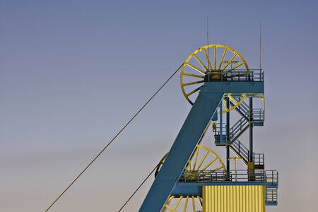 The elevator of the hoist shaft in the black coal mine. Coal mine hoist against the sky. Photo taken under natural lighting conditions