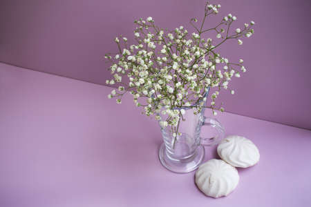 Glass vase with white flower and two zephyrs on pink background. View from above