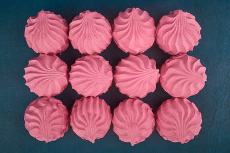 Pink marshmallow on a dark background. White and pink sweet homemade marshmallows or zephyr. The view from the top. Selective focus