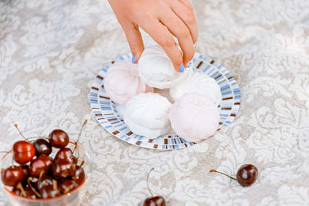 plate with marshmallow and glass bowl with cherries on white tablecloth. Vintage still life. selective focus. Shallow depth of field