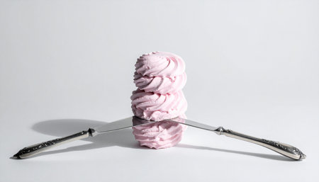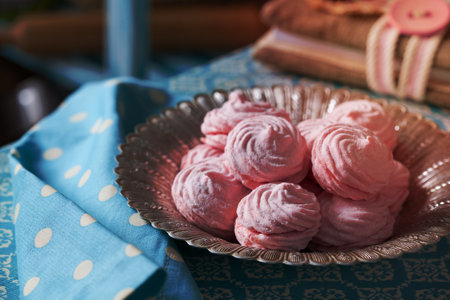 Zephyr on plate. Holiday gift concept. Food harmful to diabetics, soft focus. Table setting.