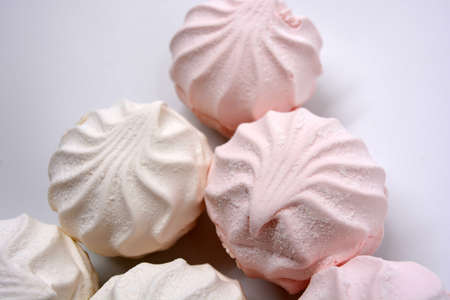 Beautiful and tasty air white pink marshmallow made in Ukraine is located on a white background.