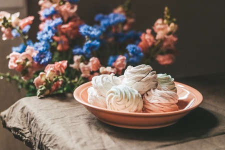 Pink plate full of zephyr sweets on a table, decorated with summer flowers