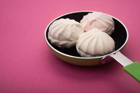 Tasty sweet zephyr in a pan and pastel pink background.