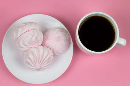 Top view of white and pink twisted meringues and coffee cup on pink background. French dessert prepared from whipped with sugar and baked egg whites. Greeting card with copy space