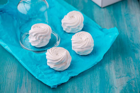 Homemade sweet colored meringue from eggs and sugar on blue background. Dessert.