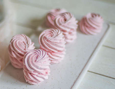 Marshmallow zefir on the white wooden background. Shallow dof.