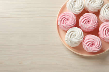 Plate with delicious pink zephyrs on white wooden table, top view. Space for text