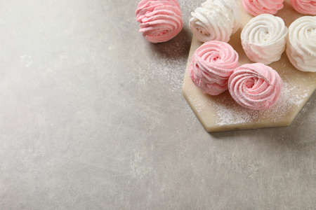 Delicious pink and white marshmallows on gray table. Space for text