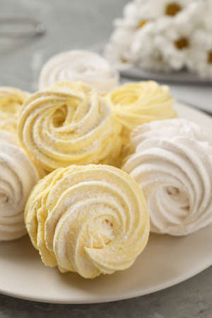 Zephyr or Marshmallow.marshmallows on a plate. sweety marshmallows or zephyr. dessert image.