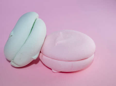 Juicy marshmallows on a pink background close-up
