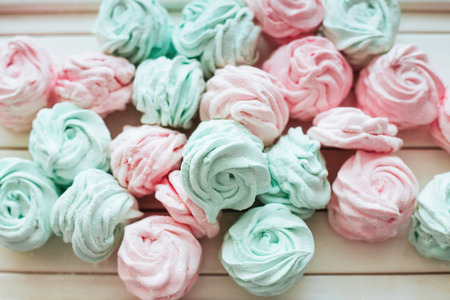 Closeup of french mini meringues cookies on food background.