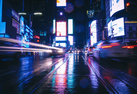 A bustling city street at night, illuminated by the glow of streetlights and the streaks of passing vehicle lights. The wet pavement reflects the colorful lights, creating a dynamic and lively atmosphere.