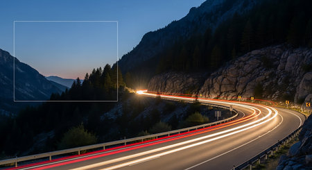 Long exposure photo of glowing car light trails illuminating a winding mountain road at dusk, creating a mesmerizing scene of movement and light