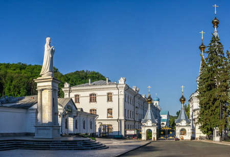 Svyatogorsk, Ukraine 07.16.2020. Monument to the Holy Mother of God near the Svyatogorsk or Sviatohirsk lavra on a sunny summer morning