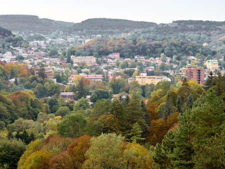 Kislovodsk town in mountains and hills in summer evening dusk under sunset cloudy sky with clouds. beautiful tranquil nature landscape, view from above.