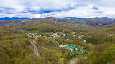 Drone view of the village in the mountains on the shore of Khosta River in cloudy day, Sochi, Russia
