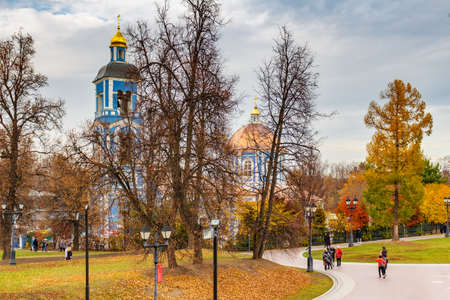 Moscow, Russia - October 16, 2019: Tsaritsyno Park landscape in cloudy autumn day. Tsaritsyno Park is popular touristic landmark in Moscow