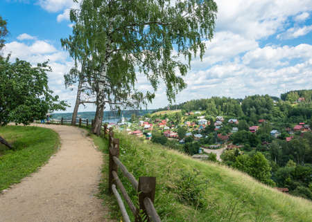 A beautiful view of the city of Ples with high mountains on a Sunny summer day, Ivanovo region, Russia.