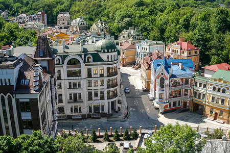 KYIV, UKRAINE, AUGUST 28, 2019: Colorful houses at Andriyivsky Uzviz street in Kiev, Ukraine