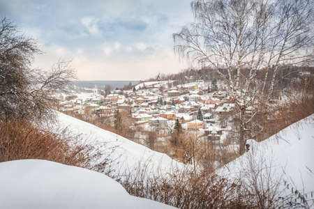 View of the houses of Plyos and the Church of Varvara on a snowy winter day