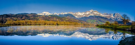 Aravis Mountain Range and its reflection on the surface of Lac du Passy, Passy, France