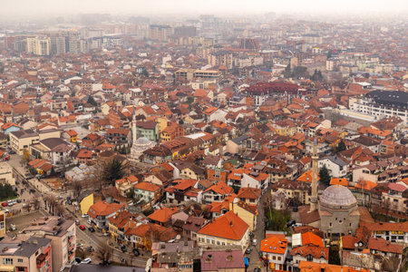 Urban panorama with mosque dome, minaret and residential buildings forming a dense city center under overcast daylight conditions, Prizren, Kosovo