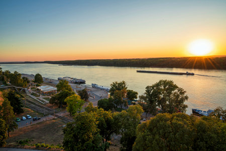 A stunning sunset overlooking the Sava River from Kalamegdan fortress in Belgrade, Serbia. Visitors relax along the riverbank, enjoying the tranquil evening.