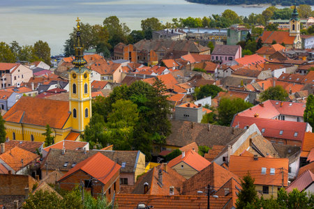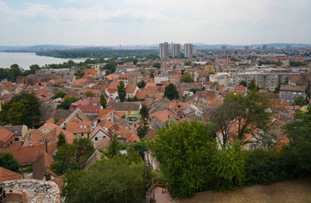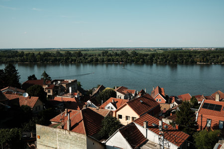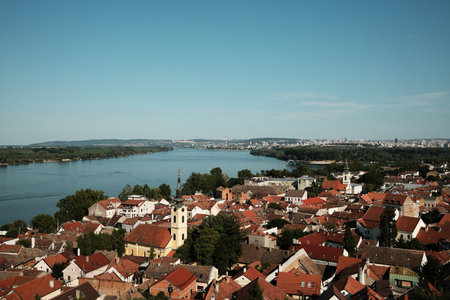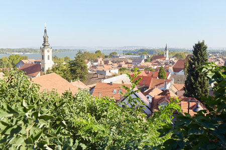 Panoramic view of red-roofed houses in Zemun, Belgrade, by the calm Danube River on a sunny summer day