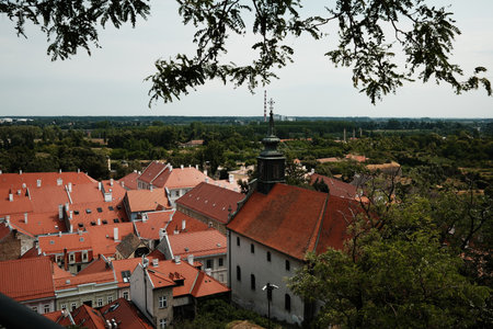 View from Petrovaradin Fortress red rooftops and church tower in Novi Sad, Serbia, surrounded by lush greenery