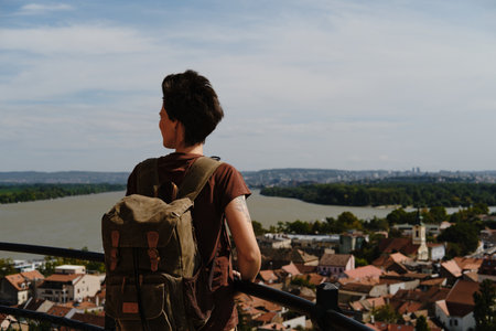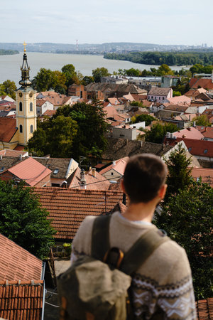 Male traveler with backpack overlooking rooftops and Danube river in Zemun, Belgrade. Rear view