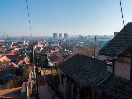 View of Zemun old town and the Danube River from Gardos Tower Millenium Tower Fortress, Serbia at the morning. Beautiful cityscape at sunrise.