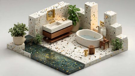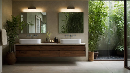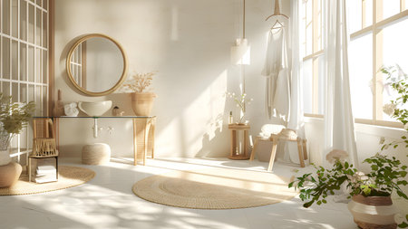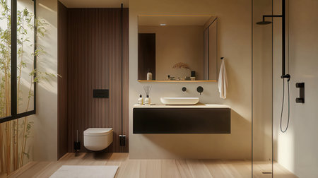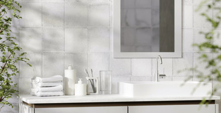 Contemporary bathroom scene with clean lines and organized accessories, 3D render illustration.