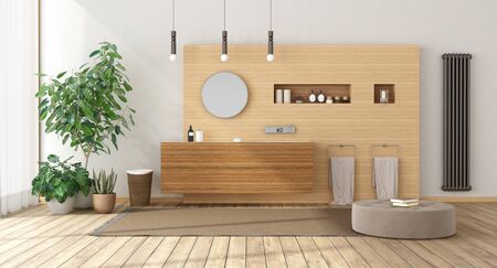 Minimalist bathroom with wooden furniture,footstool and radiator - 3d rendering