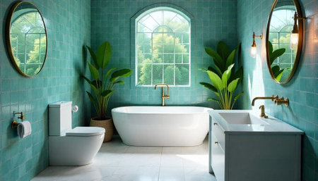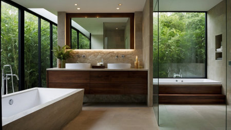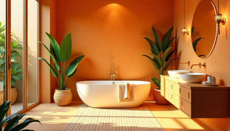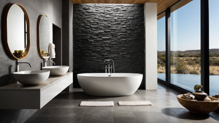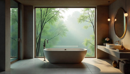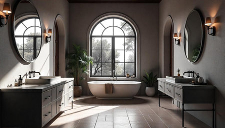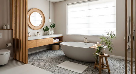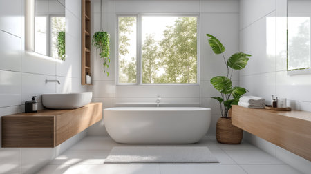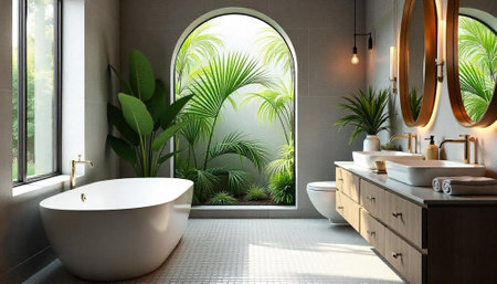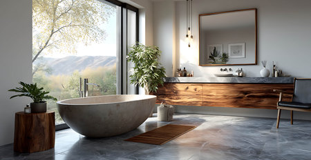 Elegant bathroom interior with bathtub, vanity, and natural light