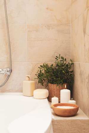 Bathroom with candles and tropical plants, relaxing atmosphere