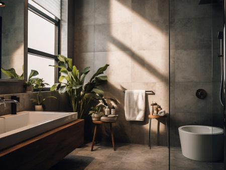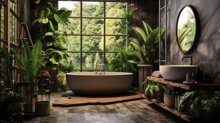 Modern contemporary dark bathroom with natural light and many green plants. Creative. Cozy apartment details.