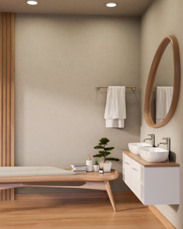 Spa essentials and books with bonsai pot aside atop wooden cushion bench or table in a bathroom with odd shape mirror. 3D rendering, 3D Illustration.