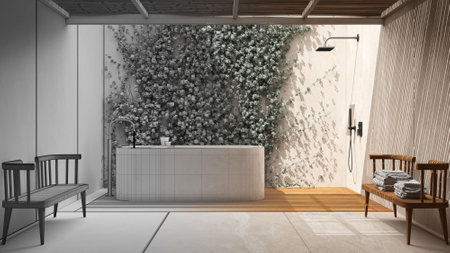 Architect interior designer concept: hand-drawn draft unfinished project that becomes real, bathroom, japanese zen style, exterior garden with ivy, bamboo ceiling. Bathtub and shower