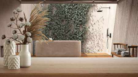 Wooden table, desk or shelf close up with ceramic vases with cotton flowers over bohemian bathroom with bathtub, boho style interior design concept
