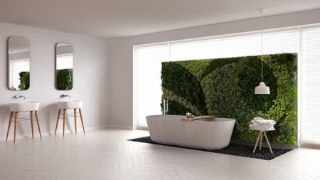 Minimal white bathroom with freestanding bathtub and side table with towels. Vertical garden and pebbles. Washbasins with mirrors, modern interior design