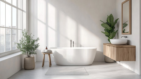 Extra white and very light minimalistic stylish elegant interior of bathroom with modern bath, green plants and wooden elements