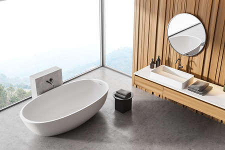Corner of hotel bathroom with wooden walls, concrete floor, comfortable bathtub standing under window and sink on wooden countertop with round mirror. 3d rendering