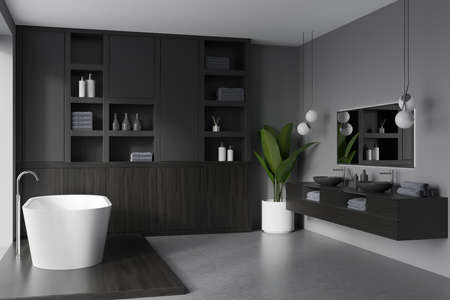 Dark bathroom interior with bathtub, double sink with mirror and shelf with accessories and decoration, plant in pot, side view, gray concrete floor. Washing room in hotel space. 3D rendering