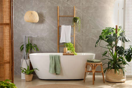 Modern white tub and beautiful green houseplants in the bathroom. interior design