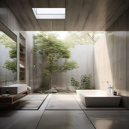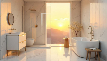 Minimalist bathroom interior with sunrise view and modern fixtures