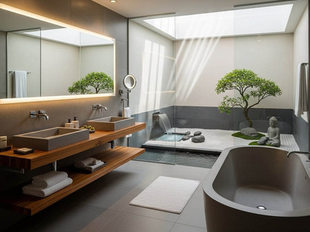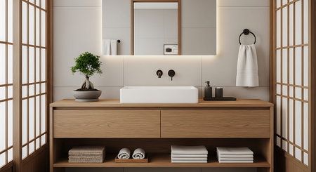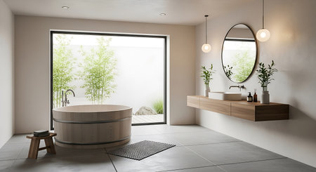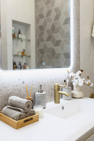 Bathroom domestic spa procedure body care tools arrangement minimal ecology space organization