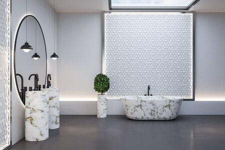 Interior design of modern elegance white bathroom with bathtub, double sinks on bathroom cabinet and mirrors. 3d render, 3d illustration
