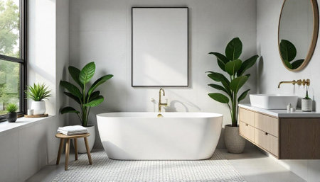 Minimalist bathroom with freestanding tub, plants, and empty frame